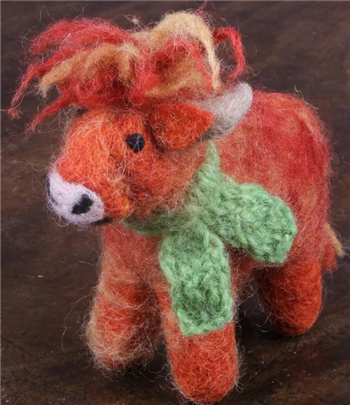 Hand felted rustic little Cow with long horns and a long shaggy coat. A hardy breed!